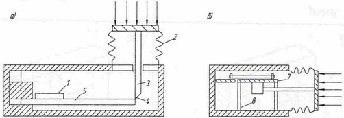 На Рисунке 4.а давление деформирует сильфон 2, который стержнем 3 через шарнир 4 воздействует на консольную пружину 5 с наклеенным на нее тензорезистором 1,