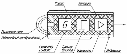 Внутри цилиндрического корпуса, выполненного из латуни или полиамида, последовательно расположенный индуктивный преобразователь токовихревого типа, генератор LC- типа, триггер Шмитта, усилитель и светодиодный индикатор, сигнализирующий о состоянии датчика. Все элементы датчика герметизированы компаундом.