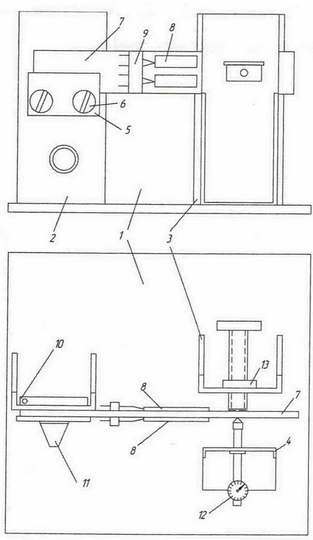 Все детали для исследования тензопреобразователей смонтированы на основании I (Рисунок5). На основании закреплены три кронштейна 2,3,4. На кронштейне 2 с помощью пластины 5, винтами 6 закреплена консольная, упругая пластина 7 с наклеенными с обеих сторон тензопреобразователями и выводами 8 тензопреобразователей припаяны к контактным штырям платы 9, соединенными с контактными переключателями 10. С помощью ручки 11 переключателя достигается включение тензорезисторов в схему тензомоста. На кронштейне 4 закреплен стрелочник 12 измерительный наконечник которого воспринимает перемещения пластины 7. На кронштейне 3 смонтирована винтовая пара 13 таким образом, что наконечник винта упирается в пластину 7.