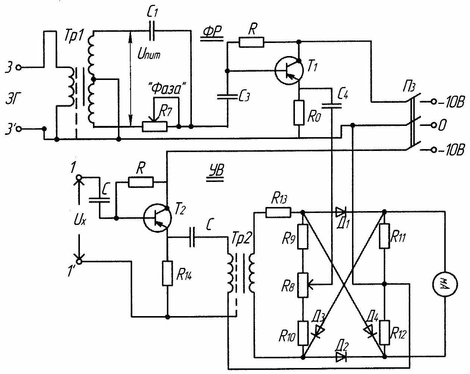 В качестве фазового регулятора используется мост, два плеча которого предоставляют собой вторичную обмотку трансформатора Тр1, а два другие плеча включены конденсатор С1 и переменное сопротивление R7. Как известно, если сопротивление нагрузки, присоединенное к выходной диагонали моста очень велико по сравнению с сопротивлением плеч моста, то изменение сопротивления R7 вызывает изменение фазы напряжения Uy, не вызывая при этом изменения его значения. При R7=0 или R7=бесконечности Uy находится в фазе или противофазе с напряжением питания моста Uпит. При