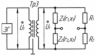 В работе исследуется мост, в два другие плеча которого включены активные сопротивления R1=R2 (Рисунок 5) питание моста осуществляется от генератор ЗГ через трансформатор Тр З.