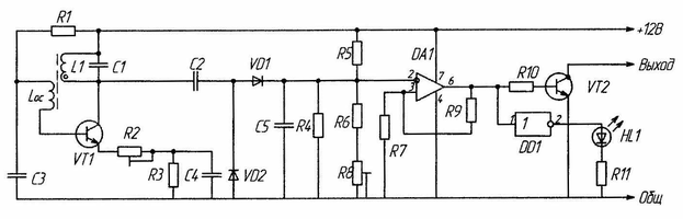 При перемещении «проводника» в зону действия магнитного поля катушки L1 потери на вихревые токи RFe возрастают пропорционально степени приближения «проводника» и соответственно уменьшается добротность θ и амплитуда колебаний падает до нуля из-за потерь энергии в колебательном контуре. При этом триггер Шмитта на DA1 срабатывает и через усилитель мощности на VT2 переводит выход «вых» в активное состояние и индикатор HL1 светится. Порог срабатывания триггера Шмитта определяется расстоянием между «проводником» и индуктивным преобразователем датчика и настраивается резистором R2 от нескольких мм до нескольких десятков мм.