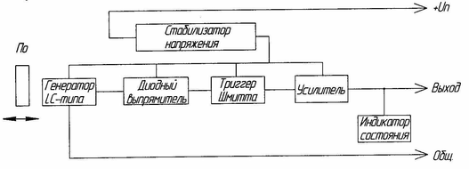 Структурная схема датчика представлена на Рисунке 1. Генератор LC-типа, вырабатывает синусоидальные колебания, амплитуда которых зависит от положения проводящего объекта ПО. После детектирования в диодном выпрямителе формируется постоянное напряжение, которое поступает на триггер Шмитта и в зависимости от величины напряжения формирует сигнал высокого или низкого уровня. Этот сигнал после усиления по мощности поступает на выход и на индикатор состояния.