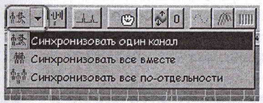 | Эта кнопка выбирает режим работы программной синхронизации. Их всего три: синхронизация только одного канала (аналог аппаратной), синхронизация всех каналов по одному уровню и с одинаковым для всех каналов размером предыстории, синхронизация |