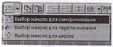 | Эта кнопка позволяет выбрать канал, над которым Вы можете произвести одно из трёх действий: "засинхронизовать", "перетащить" или выбрать для просмотра данных в числовом виде в цифровой области окна осциллографа. Номер канала, изображённый в этой кнопке, в некоторых случаях может, казалось бы, не соответствовать указанному диапазону каналов, по которым производится измерение. Это не так, манипуляции над этим каналом в такой ситуации будут совершаться "заочно". Просто надо выбрать один из воочию "видимых" каналов. |