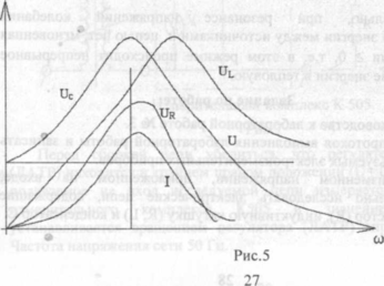 На рис.5 приведены частотные (резонансные) характеристики 1(d), Ul(cl)), Uc(co), Ur(co), ф(со) для цепи с R, L, С (рис.1) при U=const.