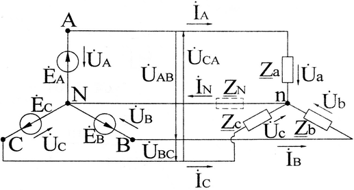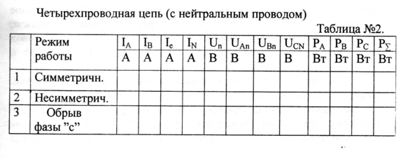 Исследовать симметричный и несимметричный режимы работы трехфазной четырехпроводной электрической цепи.