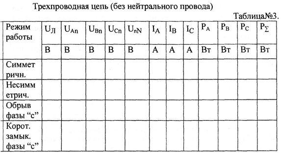 5. Исследовать симметричный и несимметричный (включая обрыв и короткое замыкание в одной из фаз) режимы работы трехпроводной трехфазной цепи при соединении приемников электроэнергии звездой.