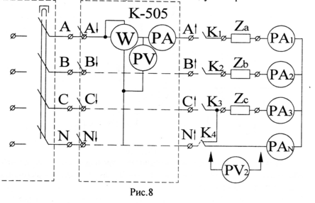 Собрать трехфазную электрическую цепь при соединении приемников энергии звездой (рис.8).