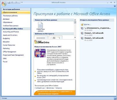 Базу данных в Access 2007 можно создавать как вручную (новую пустую базу данных), так и на основе шаблонов. Шаблоны не всегда соответствуют требуемой базе данных, но с их помощью можно быстро создать базу данных близкую к той, что требуется, а затем ее можно изменить и наполнить своими данными.