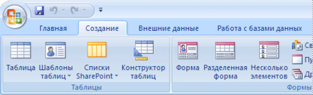 Объекты базы данных можно создать на вкладке ленты меню Создание (Рис. 1).