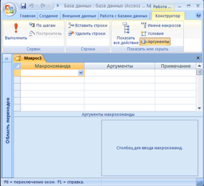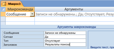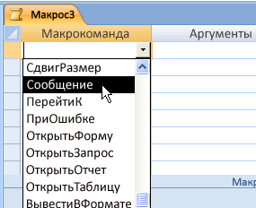 В окне построителя макросов создается список макрокоманд, которые требуется выполнить при запуске макроса. При первом открытии построителя макросов будут отображены столбцы Макрокоманда, Аргументы и Примечание.