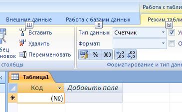 Программа автоматически создала первый столбец будущей таблицы, назвав его «Код» (Рис. 1). Этот код мы будем позже использовать при создании связей между таблицами. Если вы щелкните мышью на поле со значком «№», то станет активным поле «Тип данных» в котором отобразится слово «Счетчик». Это означает, что программа будет автоматически нумеровать строки нашей таблицы.