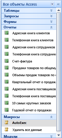 БД «Борей» используется в качестве экспериментальной базы лабораторного практикума и представляет все объекты Access (таблицы, запросы, формы, отчеты, страницы, модули, макросы).