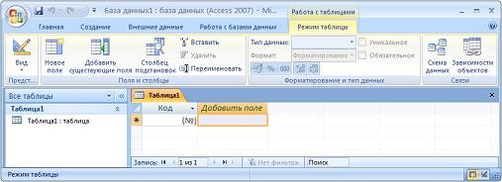 После создания пустой новой базы данных приложение Access создаст и откроет ее в режиме таблицы (Рис. 1).