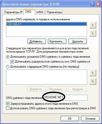 Нижний переключатель переводим в положение «Использовать следующие адреса DNS-серверов» и в поле «Предпочитаемый DNS-сервер» также вводим адрес управляющего компьютера – 192.168.0.1. Далее нажимаем кнопку «Дополнительно», переходим на вкладку «DNS» и в поле «DNS-суффикс подключения» вводим MSHOME.NET (ICS Windows XP всегда использует имя домена MSHOME.NET; например, для компьютера с именем COMP1 полное имя внутреннего клиента будет COMP1.MSHOME.NET).