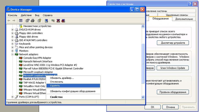 Удаление Microsoft Loopback Adapter в Microsoft Windows XP.