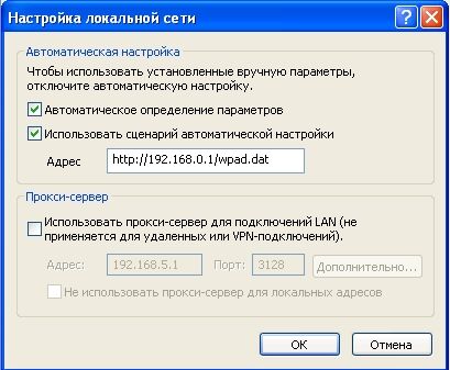 поставим галочку напротив опции "Автоматическая конфигурация прокси-сервера" и в поле "Адрес" написать http://192.168.0.1/wpad.dat