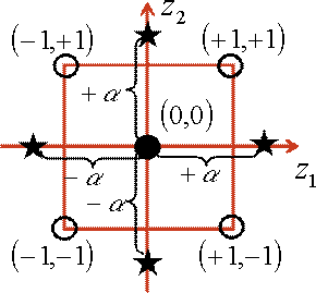 Для построения ортогонального плана второго порядка,кроме экспериментов в центре плана добавляют эксперименты в, так называемых,звездных точках. Они лежат на осях координат факторного пространства и находятся на расстоянии