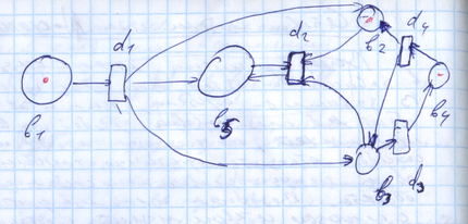 Переход из одного состояния в другое осуществляется лишь в том случае, если выполняются определенные требования при функционировании параллельных процессов. Эту функцию отслеживает переход (d), то есть переход может срабатывать лишь в том случае, если в системе для какого-либо перехода создаются условия срабатывания (переход возбужден).