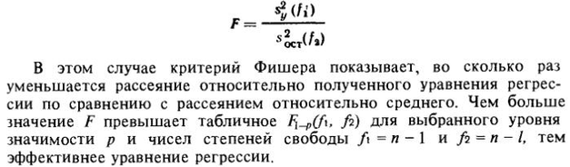 Критерий Фишера показывает, во сколько раз уменьшается рассеяние относительно полученного уравнения регрессии по сравнению с рассеянием относительно среднего.