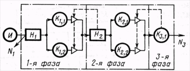На рисунке представлена трехфазная Q-схема (L =3) с блокировкой каналов по выходу в 1-й и 2-й фазах обслуживания (пунктирные линии на рисунке). В качестве выходящих потоков такой Q-схемы могут быть рассмотрены поток потерянных заявок из
