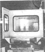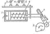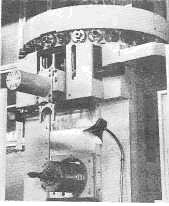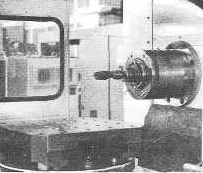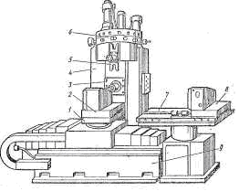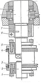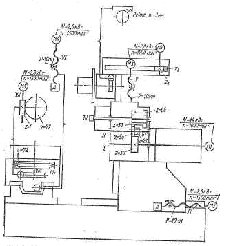 | Кинематика станка (рис. 2). Главное движение шпиндель !И получает от регулируемого электродвигателя постоянного тока Ml (JV = 14 кВт, n = 1000 мин"1) через двухступенчатую коробку скоростей. Изменение частоты вращения шпинделя производится в пределах 1000—3150 мин"1 при постоянной мощности и 21 — 1000 мин""1 при постоянном моменте. Блок Ы переключается гидравлически. С блока зубчатых колес z — 33, z = 66 крутящий момент на шпиндель передается через зубчатую муфту, таким образом шпиндель полностью разгружен от изгибающих сил, возникающих от приводных колес. Зажим инструмента происходит от тарельчатых пружин, отжим — гидроцилиндром. Для того чтобы пазы оправки и шпинделя для шпонок совпадали, нужно шпиндель и оправку предварительно сориентировать. Для этого в станке имеется механизм угловой ориентации (рис. 3). При подаче масла в бесштоковую полость гидроцилиндра 1 происходит фиксация шпинделя, при этом шток через рычаг 7 прижимает ролик 8 к диску ориентации 9, жестко связанному со шпинделем. В положении, указанном на схеме, планка 2 заставляет сработать бесконтактный выключатель 3, обеспечивающий снижение скорости вращения и остановку шпинделя. При попадании ролика 8 в паз диска 9 происходит фиксация диска и шпинделя в определенном угловом положении. Для расфиксацни масло из левой полости цилиндра сливается и поршень со штоком перемещаются влево пружиной 6. Конечные выключатели 4 и 5 контролируют фиксацию и расфиксацию шпинделя. Рис 3. Механизм угловой ориентации шпинделя. Подачи (см. рис. 2) стойки, шпиндельной бабки, стола, осуществляются от высокомоментных двигателей с постоянными магнитами М2, N13, М4 (N = 2,8 кВт; я = 1500 мин"1). Ходовые винти качения IV, V, VI соединены с электродвигателями напрямую через специальные муфты 4, обладающие высокой крутильной жесткостью и допускающие некоторую несоосность и перекос вала двигателя 2 и ходового винта 8. Регулировка муфты осуществляется натяжкой конических втулок 3 и 5 при помощи винтов 1. В опорах винтов качения всех приводов подач установлены прецизионные подшипники 9Б обладающие высокой нагрузочной способностью и жесткостью. Предварительный натяг в подшипниках создается гайкой 7 до исключения зазора. Гайка 7 стопорится винтом 6. Направляющие всех подвижных механизмов имеют смешанное трение; боковые и нижние направляющие выполнены на опорах качения, лицевые направляющие скольжения выполнены из поли¬мерного антифрикционного материала. Приводы подач комплектуются датчиками обратной связи типа индуктосин или резольвер. При комплектации с резользером станок имеет класс точности Н и обозначается ИР500МФ4. Рис 4. Привод подач станка ИР500ПМФ4. Поворотный стол (см, рис. 2) получает вращение от высоко-моментного электродвигателя М5 (N = 2,8 кВт, n —1500 мин"1) через червячную пару г = 1—72, Перед поворотом от гидросистемы происходит расцепление двух зубчатых полумуфт г = 72 муфты M1с торцовыми зубьями треугольного профиля. После поворота происходит сцепление зубчатых муфт и зажим стола. Шпиндельная бабка. Жесткий шпиндель, изготовленный из легированной стали с высокой поверхностной твердостью, ■ монтируется на прецизионных подшипниках, _ что обеспечивает высокую точность, жесткость и виброустойчивость. Вращение шпинделя осуществляется от электродвигателя постоянного тока через трехступенчатую коробку скоростей В предел