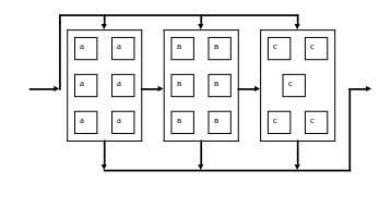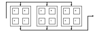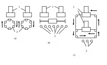 Здесь : 1 – многоцелевые станки; а) – с многопозиционными устройствами автоматической смены спутников, в) – с линейным потоком заготовок, с) – с кольцевым потоком заготовок; 2 – участок загрузки – выгрузки.