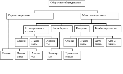 Наибольшее применение имеет многопозиционное сборочное оборудование (М), на котором сборка изделия производится одновременно на нескольких рабочих позициях; при этом собираемое изделие транспортными устройствами последовательно перемещается между рабочими позициями для выполнения процесса сборки. Классификация сборочного оборудования представлена на следующем рисунке.