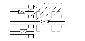 На рис.10.1 станки 1 расположены параллельно стеллажу- накопителю 2. Кран- штабелер 4 перемещается вдоль фронта станков и обслуживает как стеллаж- накопитель, так и станки. 3- перегрузочный стол. На рис.10.2 четыре стеллажных накопителя 2 и два крана- штабелера 1 . Автоматическая транспортная тележка 6, перемещаясь по рельсовому пути 7, обслуживает несколько единиц технологического оборудования. С перегрузочного стола 3 тележка транспортирует тару с заготовками к накопителям 5 станков 4.