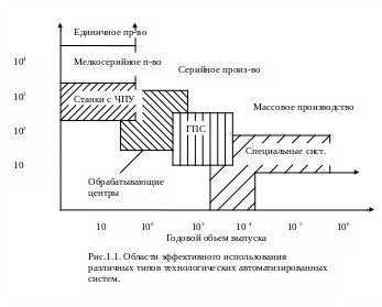 На рисунке 1.1 показано место различных типов технологических процессов с максимальной экономической эффективностью в зависимости от объема выпуска и номенклатуры выпускаемых изделий.