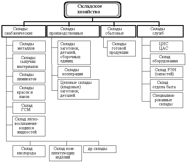 Структура складского хозяйства (рис. 1) зависит от специфики производственного процесса, типа производства и объема выпуска продукции.