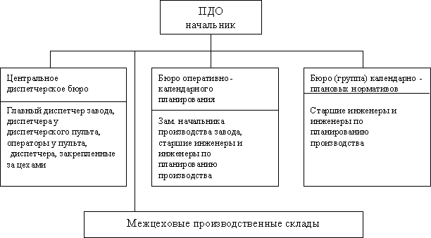 Под диспетчированием производства понимается централизованное руководство работой всех органов предприятия на основе плана - графика, а также систематического учета и контроля текущего хода производства. Для осуществления функции диспетчирования в составе ПДО предприятия создается диспетчерская служба, основной задачей которой служит поддержание бесперебойного и ритмичного хода производства в соответствии с заданным планом запуска-выпуска продукции на всех стадиях ее изготовления.
