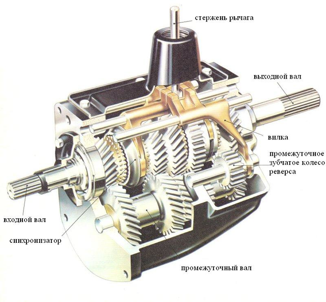 Коробка передач состоит из картера, в котором расположены входной, промежуточный и выходной валы с шестернями и синхронизаторами, и механического привода переключения передач.
