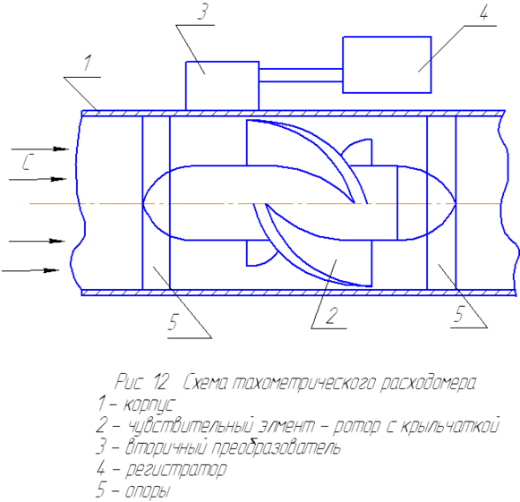 В тахометрических первичных преобразователях движущийся поток жидкости (газа) приводит во вращение первичный элемент – ротор, скорость вращения которого является мерой скорости (расхода) потока рис. 12. Таким образом скоростной тахометрический расходомер состоит из первичного, вторичного преобразователей и измерительного прибора с регистрирующим устройством. Частотная модуляция сигнала датчика (при малой инерционности ротора) позволяет сочетать высокую точность и малую инерционность измерения расходов. В современных расходомерах такого типа для измерения расходов в трубопроводах диаметром от 4 до 1000 мм, суммарная погрешность составляет до