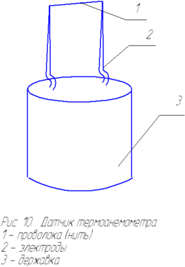 Термоанемометр является одним из электрических средств измерения скорости, а следовательно и расхода газа (жидкости). Термоанемометр – это устройство, основанное на использовании закономерностей теплообмена между подогреваемой электрическим током нитью (проволокой) и потоком газа, охлаждающем эту нить рис. 10. Чем больше нить отдает тепла, тем ниже её температура, меньше электросопротивление, и следовательно, больше скорость движения газа (жидкости). Термоанемометры применяются двух типов: