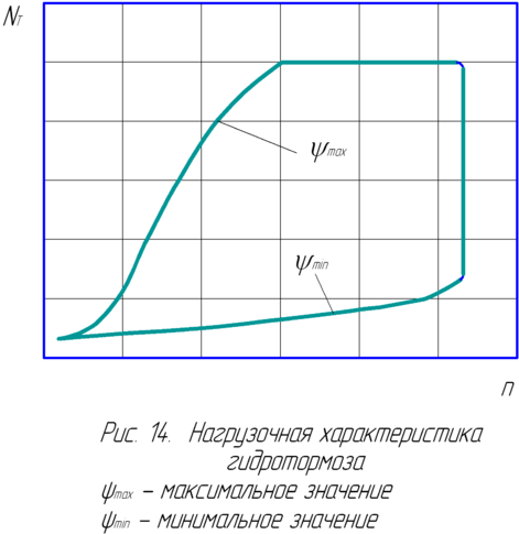 Измерить этот момент можно, например, установив подшипники (опоры) турбины в «стакане», имеющем возможность поворачиваться в неподвижном корпусе станины. В этом случае момент сил с наружных обойм подшипников передается «стакану» и с помощью рычагов передаются динамометру. Каждый гидравлический тормоз имеет свою тарировочную нагрузочную характеристику – зависимость поглощаемой мощности от оборотов для разной степени загрузки (заполняемой водой). - Рис. 14.