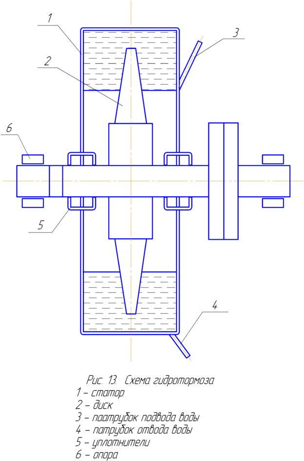 Поглощение мощности в гидротормозе происходит вследствие выполнения работы трения ротора о жидкость и работы на ее перемещения. Во время работы вода нагревается. Необходимое для работы гидротормоза количество воды Gводы определяется по уравнению баланса:
