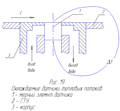 Для регистрации величины теплового потока в течении длительного времени применяют так называемые охлаждаемые датчики тепловых потоков – рис. 19.