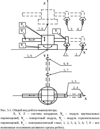Таким образом, всего манипулятор робота может находиться в восьми показанных на рисунке 5-1 положениях, в исходном положении манипулятор находится в точке 1.