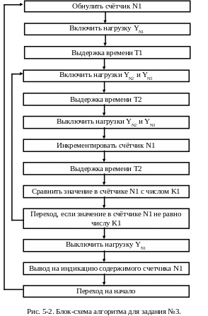 Напишите программу управления роботом ПР5-2 по блок-схеме, приведённой на рисунке 5-2. Составленную программу внесите в таблицу №5-1. По блок-схеме и составленной по ней программе начертите циклограмму работы робота. После согласования с преподавателем введите программу в микроконтроллер и запустите её на исполнение. Зафиксируйте результаты работы программы и сделайте выводы.