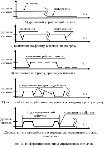 Самый простой случай – сигнал «импульс». Объект управления совершит действие тогда, и только тогда, когда управляющий сигнал совершит фронт, удержится заданное время на высоком уровне, и затем переключится срезом на низкий уровень. Такой управляющий сигнал применяется для управления реверсом шагового двигателя. На рисунке 15 поз «д» показан сложный управляющий сигнал, состоящий из двух импульсов различной длительности. Для управления реверсом шагового двигателя, как правило, применяются сигналы, состоящие из одного импульса (пары фронта и среза).