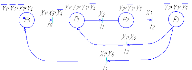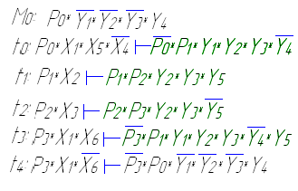 Это промежуточное описание можно осуществлять на языке систем секвенций, обладающих известными положительными свойствами. Для алгоритмов логического управления дискретными технологическими объектами очень подходит аналитическая форма графа операций в виде системы конъюктивных секвенций, которая упрощает переход от первичного графического описания к управляющей программе. При этом в левой части секвенциальных операторов содержится конъюкция, состоящая из логических переменных, кодирующих позиции, из которых ведет данный переход графа операций и логических переменных, взвешивающих данный переход. В правой части содержится конъюкция, состоящая из логических переменных, кодирующая позиции, в которые ведет данный переход и логических переменных, взвешивающих эти позиции.