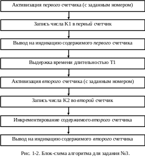 | Номер варианта | Номер страницы памяти | Номер первого счетчика | Номер второго счетчика | число K1 | Число K2 | T1, сек |
