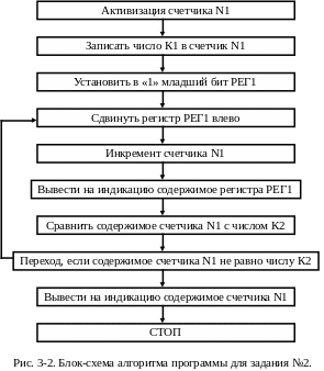 Напишите программу, реализующую вращение регистра в цикле с помощью счетчика по блок-схеме, приведенной на рисунке 3-2. Составленную программу внесите в таблицу №2-1. Введите программу в микроконтроллер и запустите её на исполнение. Зафиксируйте результаты работы программы и сделайте выводы. Результаты работы программы оформите, как и в предыдущих заданиях, по форме таблицы №1-1.