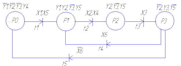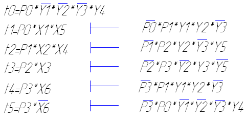 Мы составляем аналитическую форму графа операций в виде системы конъюктивных секвенций, упрощающую переход от первичного графического описания к управляющей программе. При этом в левой части секвенционных операторов содержится конъюкция, состоящая из логических переменных, кодирующих позиции, из которых ведет данный переход и логических переменных, взвешивающих данный переход. В правой части содержится конъюкция, состоящая из логических переменных, кодирующая позиции, в которые ведет данный переход и логических переменных, взвешивающих эти позиции.