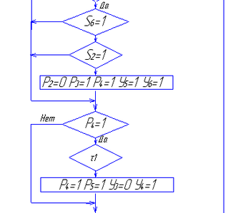Позиции графа помечены функциями (конъюнкциями) сигналов на исполнительные механизмы и органы индикации объекта управления, а переходы функциями (конъюнкциями) сигналов от датчиков и органов управления.