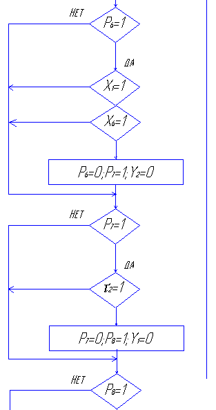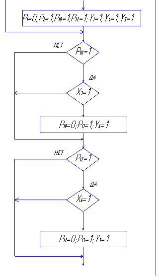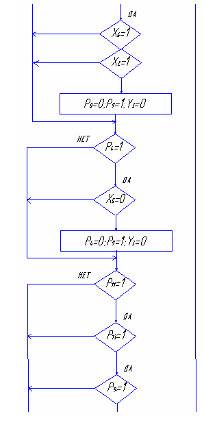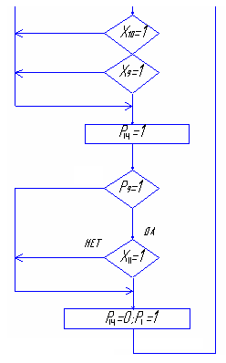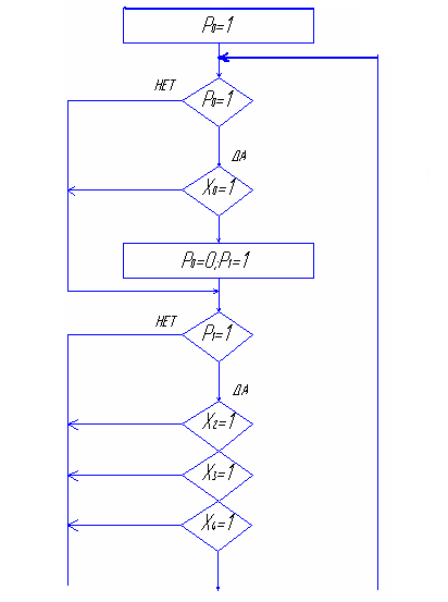 Позиции графа помечены функциями (коньюнкциями) сигналов на исполнительные механизмы и органы индикации объекта управления, а переходы функциями (коньюнкциями) сигналов от датчиков и органов управления.