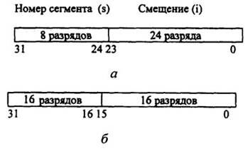 Если ЭВМ имеет 32-битовую адресную структуру, максимальная длина адреса в единственном сегменте будет длиной 32 разряда. Если 16 разрядов из 32 отвести под номер сегмента (а 16 - под смещение), то в этом случае все адресное пространство программы может состоять из 216= 64 Кбайта сегментов. Сегмент может содержать 216= 64 Кбайта (т.е. иметь адреса от 0 до 65535). При другой структуре адреса изменяются количество сегментов и их длина.