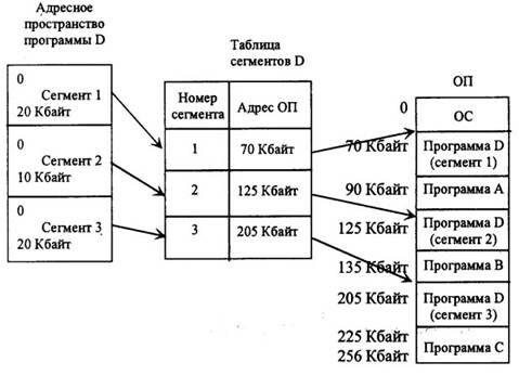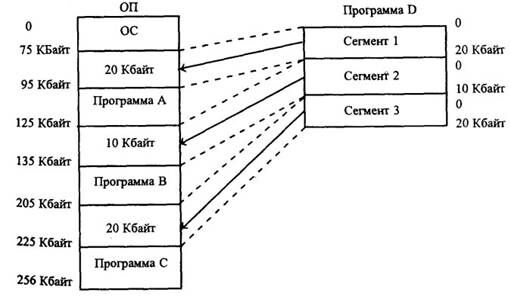 В настоящее время разработано несколько способов решения этих противоречий. Например, для борьбы с фрагментацией основной памяти адресное пространство программы может быть разбито на отдельные сегменты, слабо связанные между собой. Тогда (рис.6) программа D общей длиной 50 Кбайт может быть представлена в виде ряда сегментов, загружаемых в различные области ОП. Это позволяет использовать реальную память, теряемую из-за фрагментации.